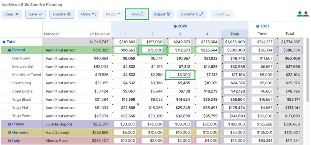 If you use Inphinity Forms Planning, you may appreciate the option to hold cells to fix their values from any further distribution or adjustment spread update.